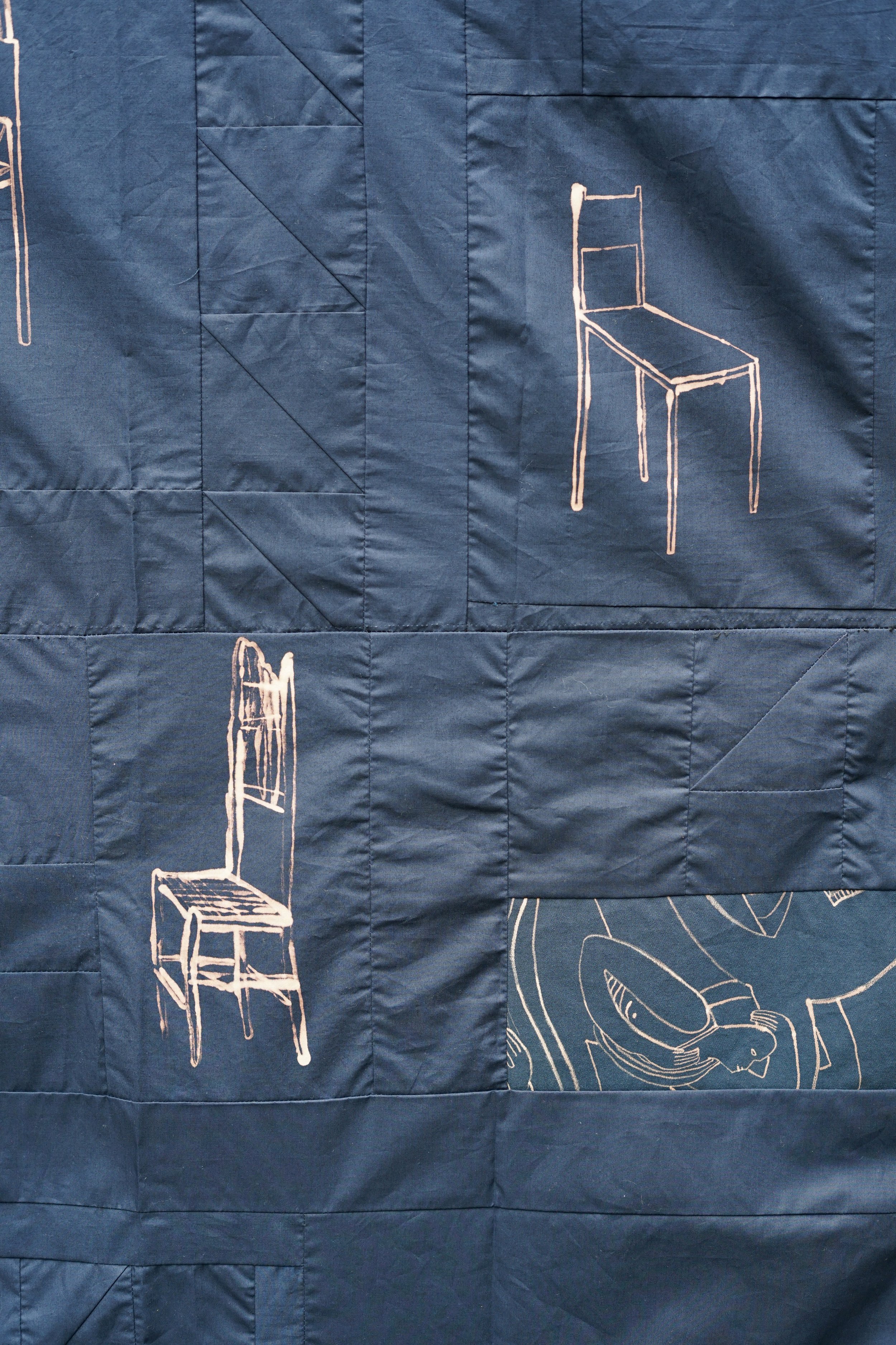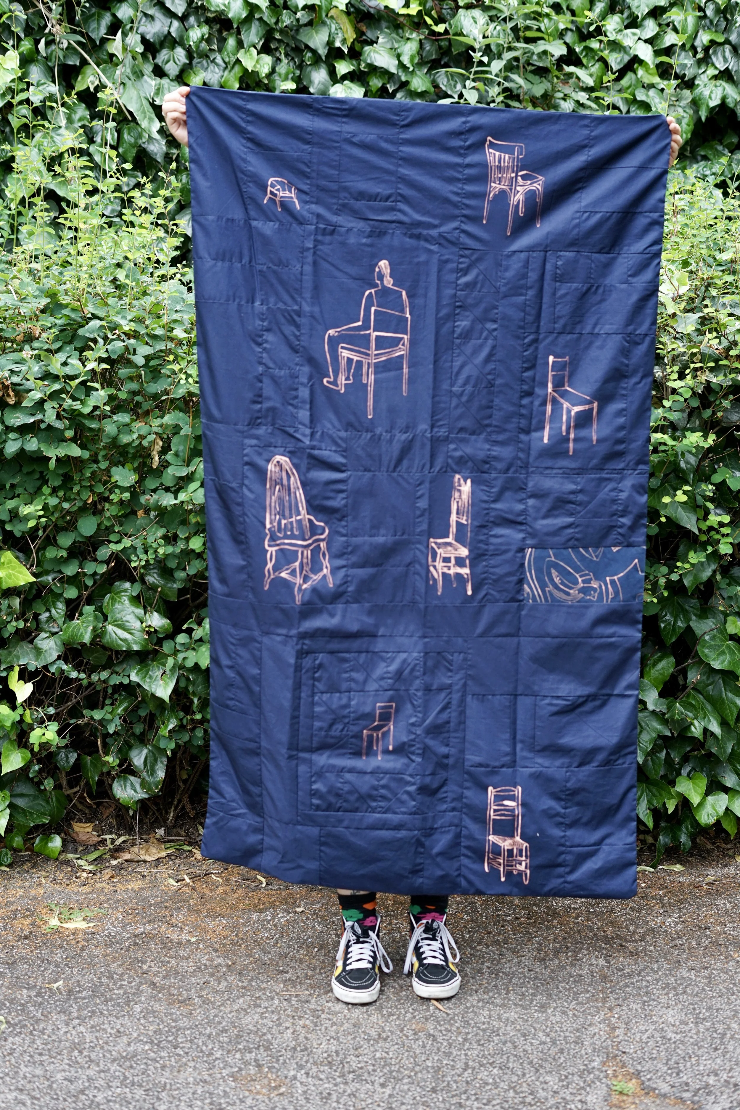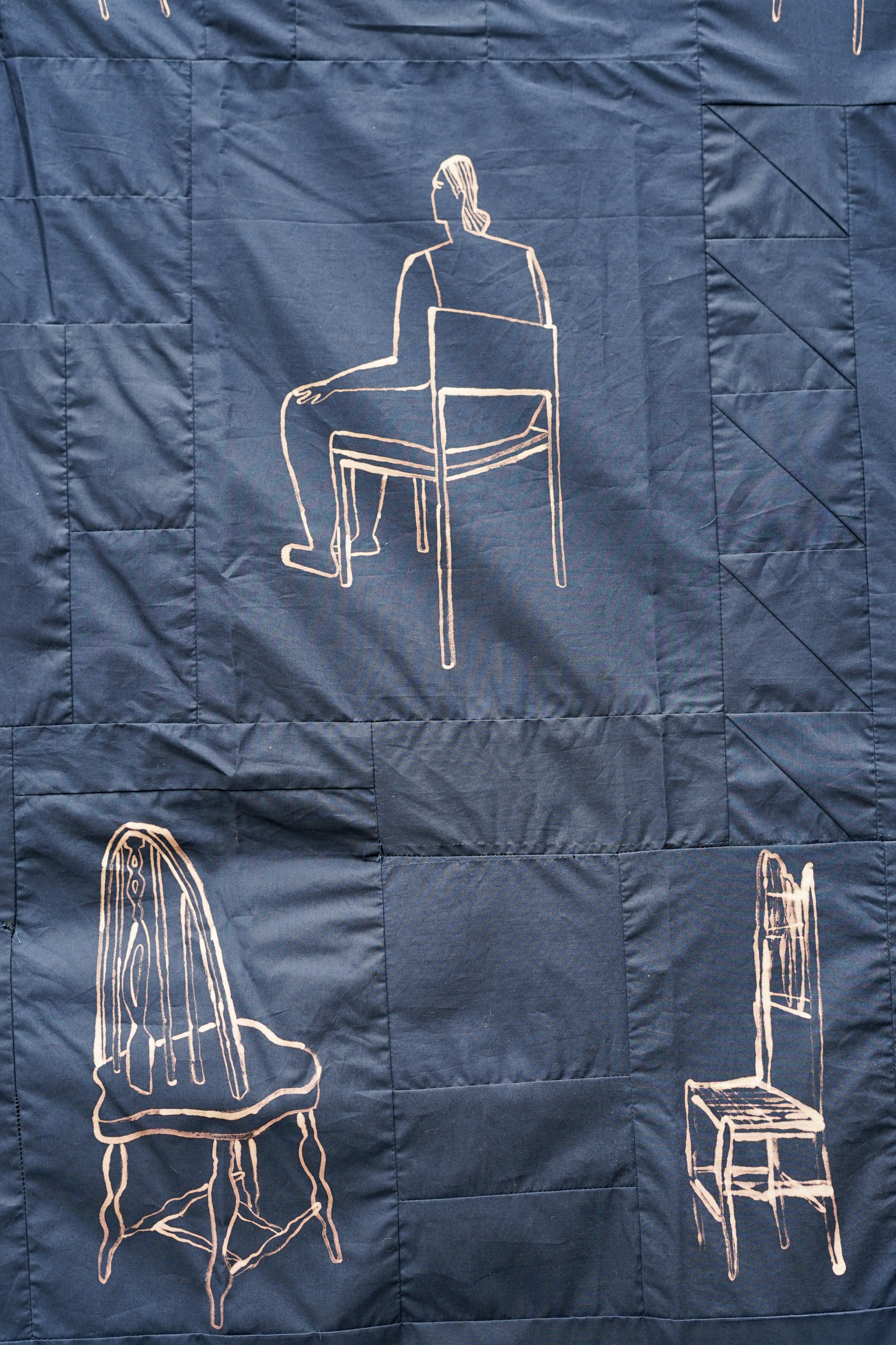 Quilt made from prussian blue cotton with bleach painting. Exploring the burden of having a body and how personal identity can feel intangible. All chairs depicted on the quilt are found in queer venues in London.