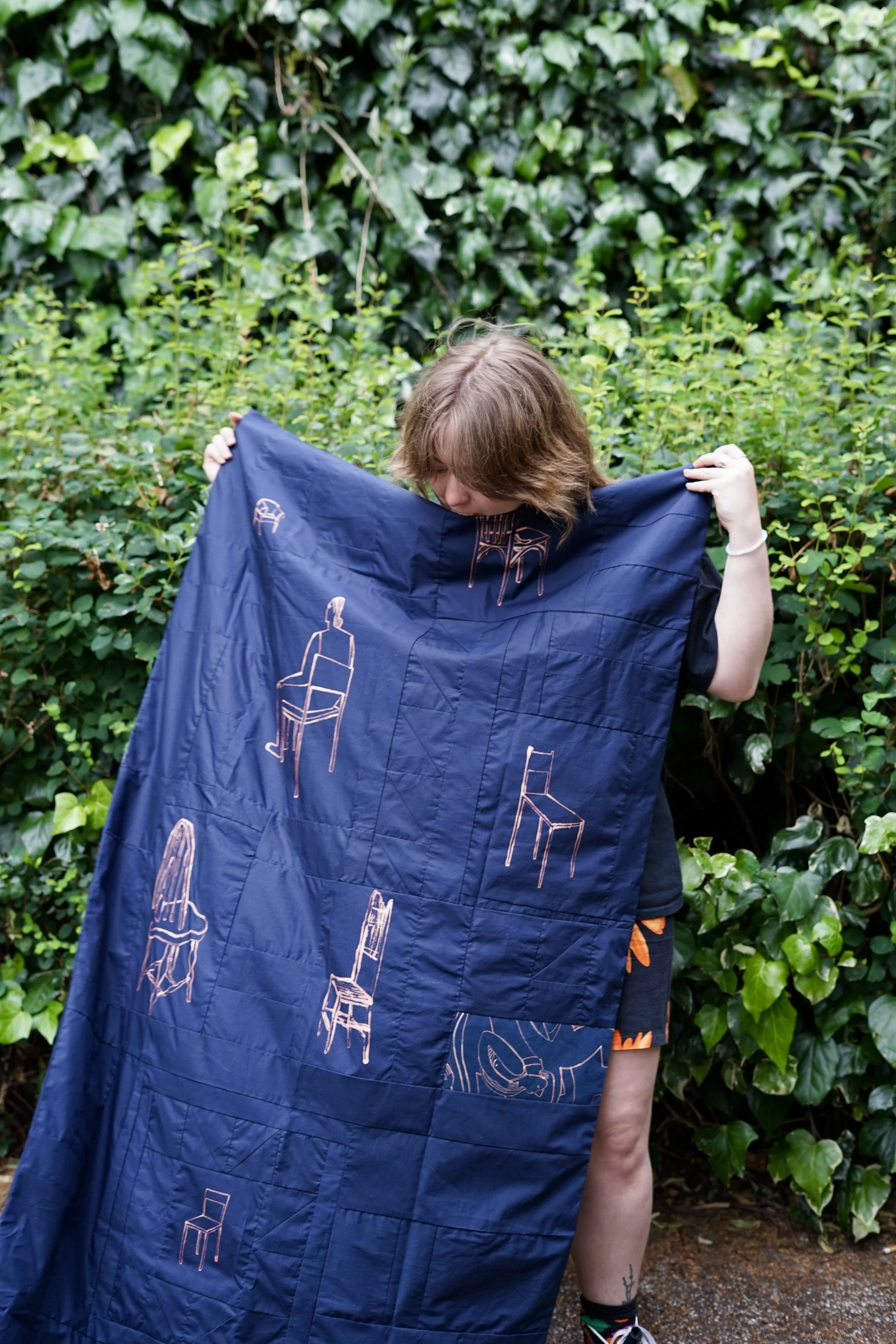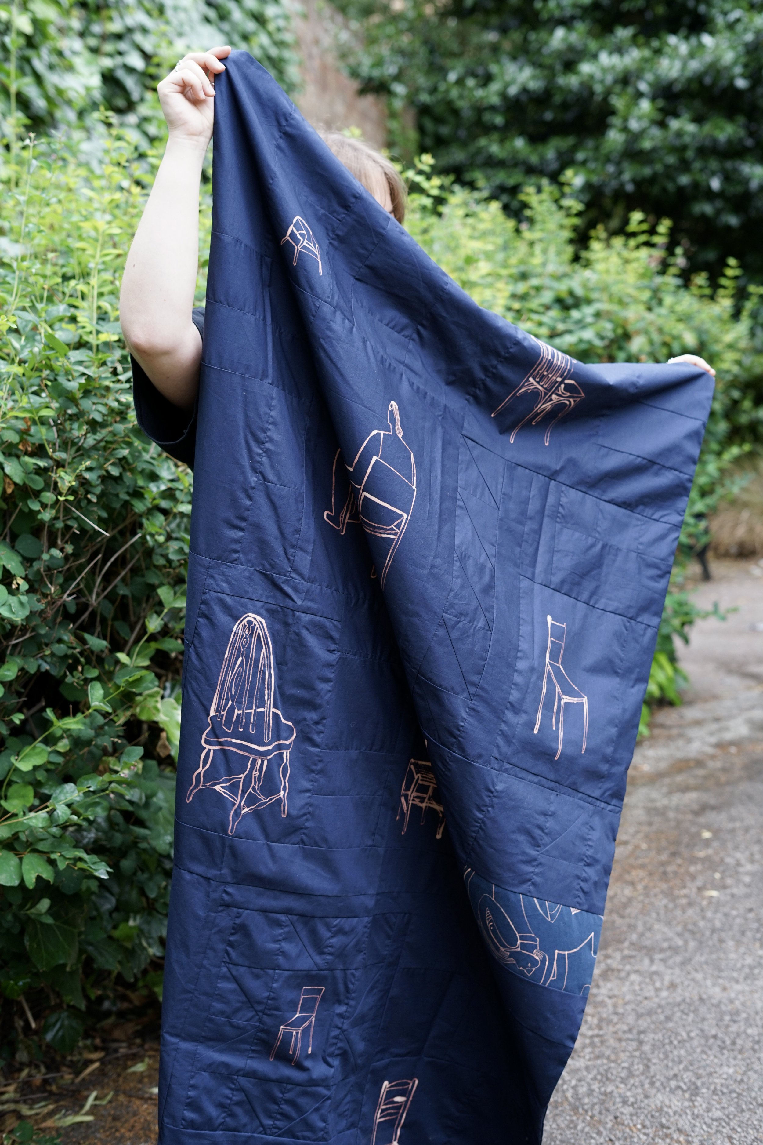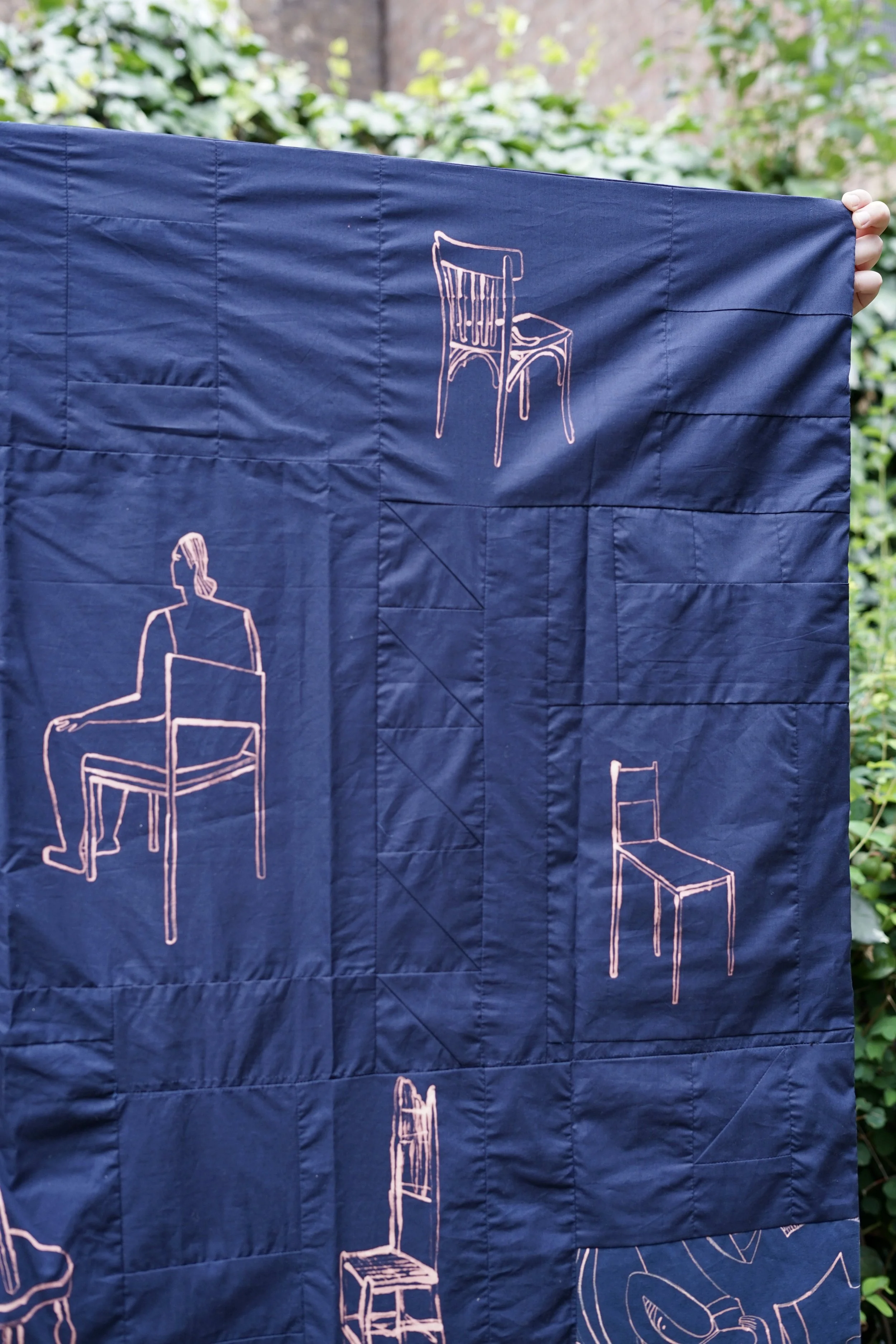 Quilt made from prussian blue cotton with bleach painting. Exploring the burden of having a body and how personal identity can feel intangible. All chairs depicted on the quilt are found in queer venues in London.