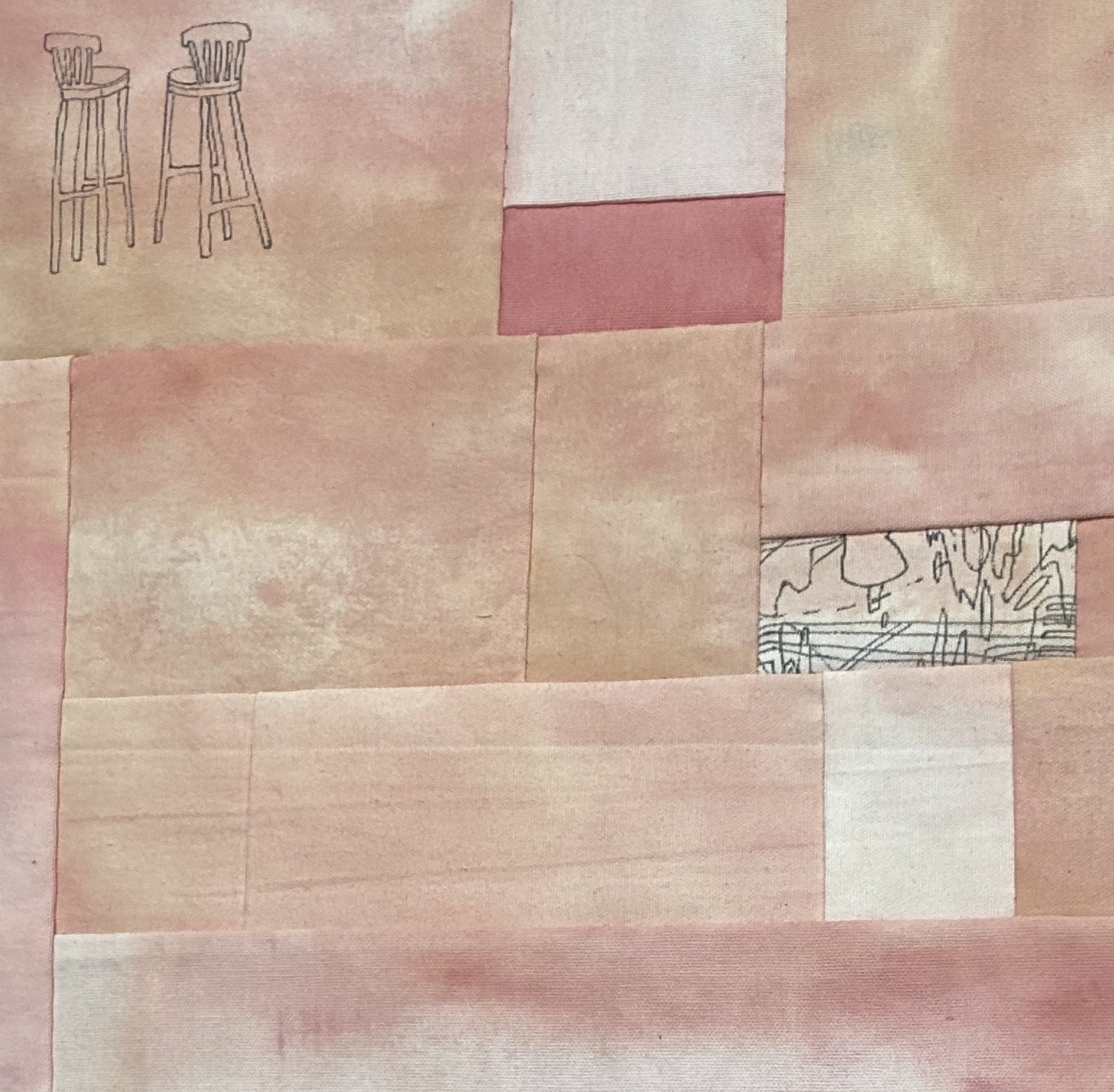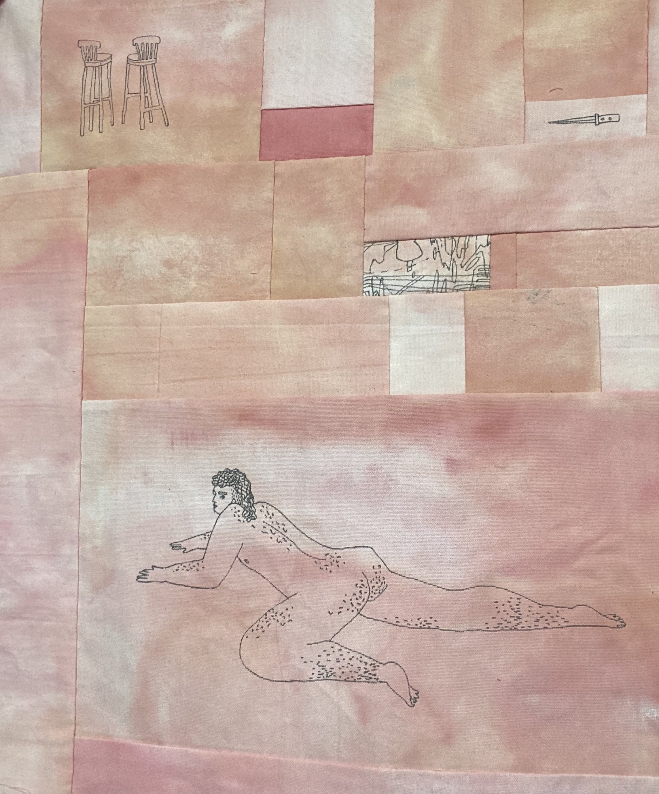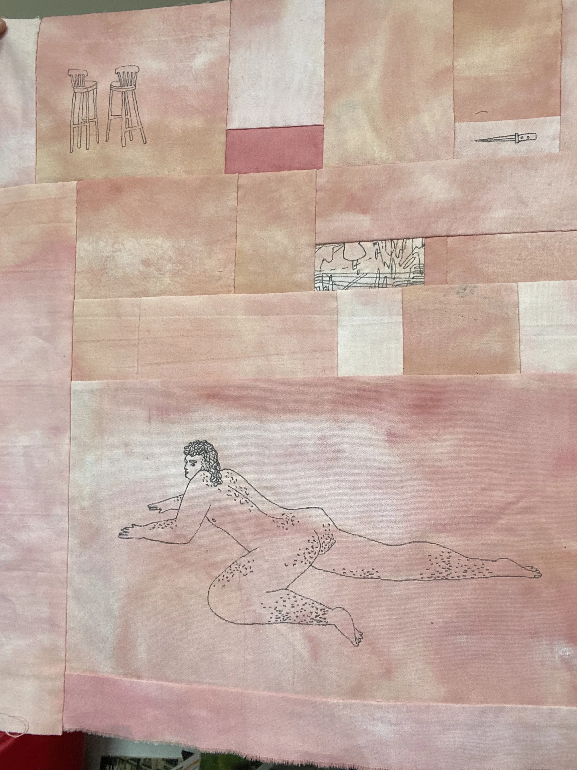 Quilted textile on white cotton painted with gouache and pen drawing.